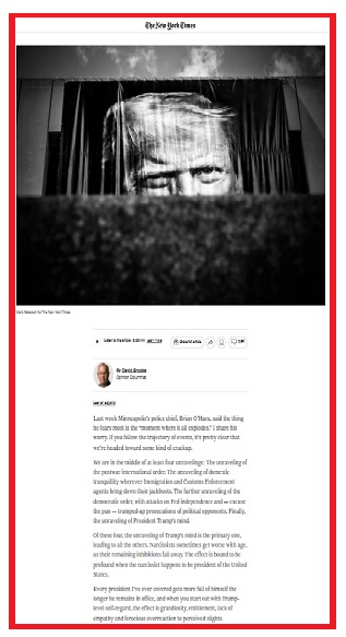 في مقالة الرأي الخاصة به عبر نيويورك تايمز، كتب دايفيد بروكس منذ أيام مقالة “خطيرة” بعنوان: “انهيار ترامب القادم”، توقع فيها أربعة انهيارات “ترامبية” قريبة، على الأقل: